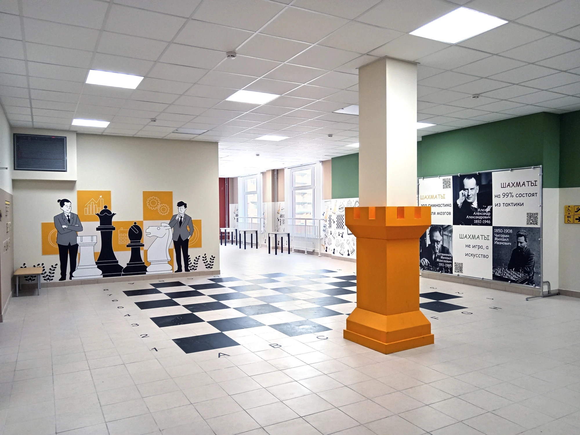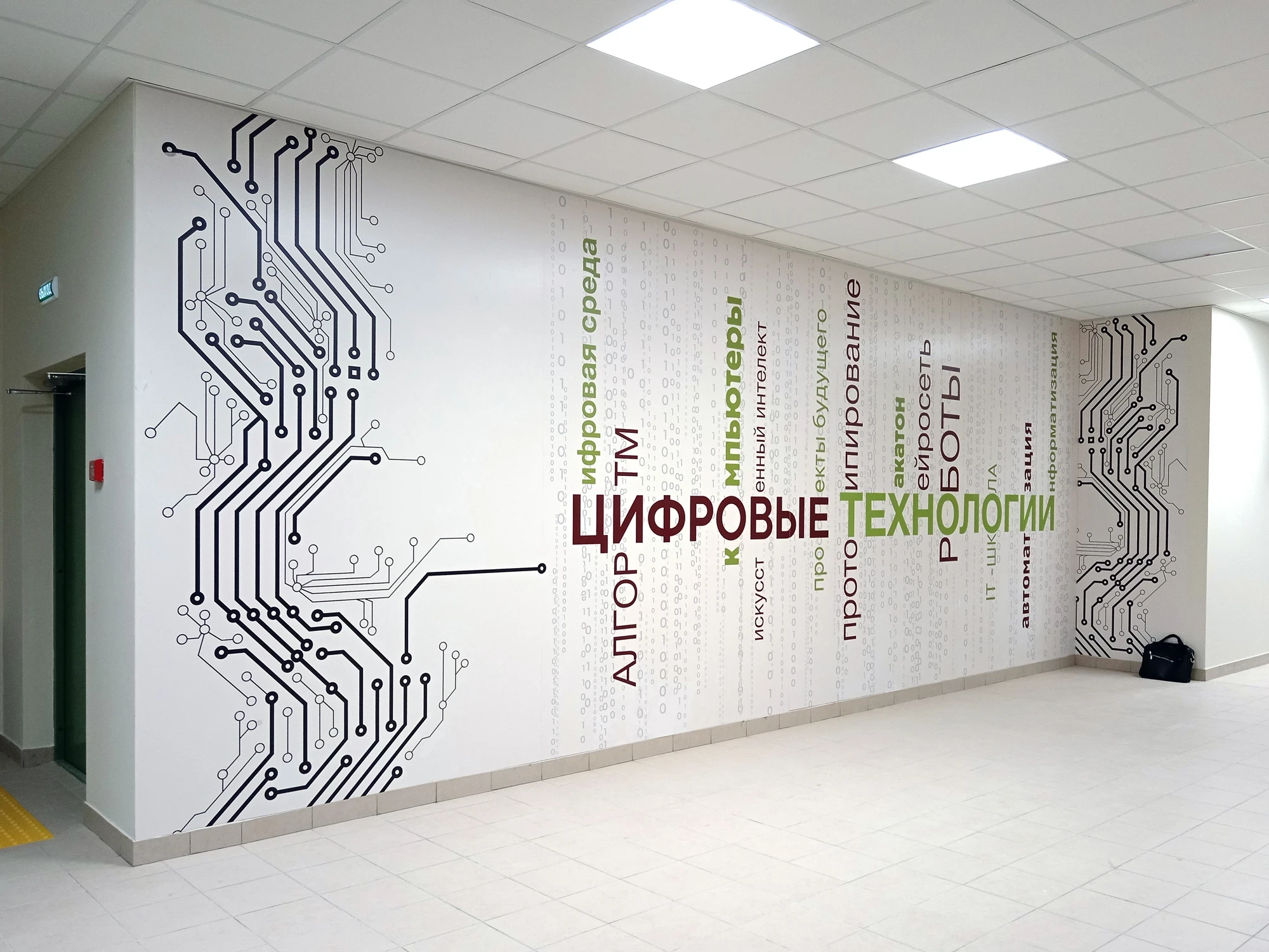 В рамках данного проекта мы оформили более 1000м2 стен в коридорах и помещениях школы – визуальная навигация, декоративные элементы, таблички на двери, уличные указатели и многое другое!
