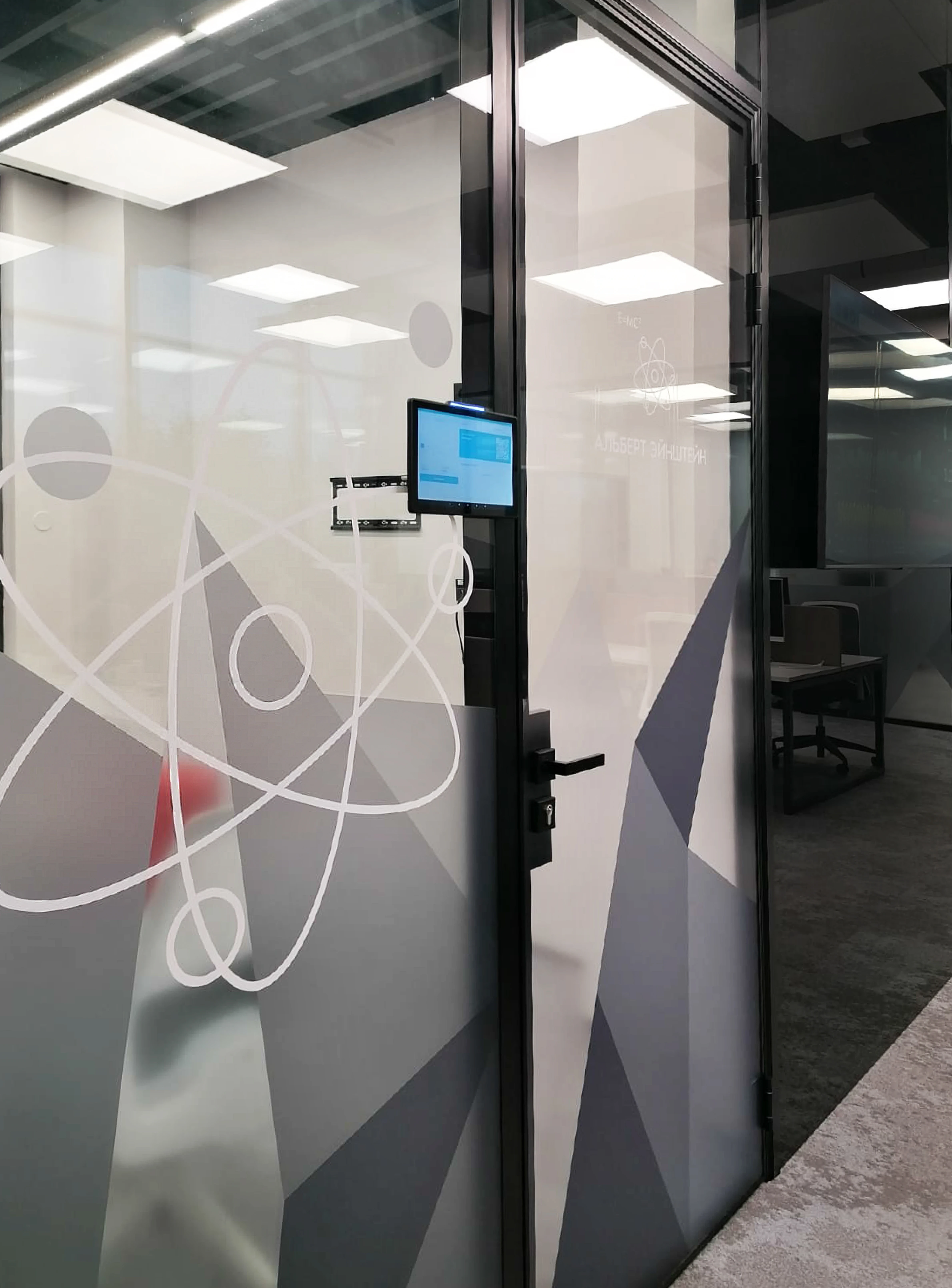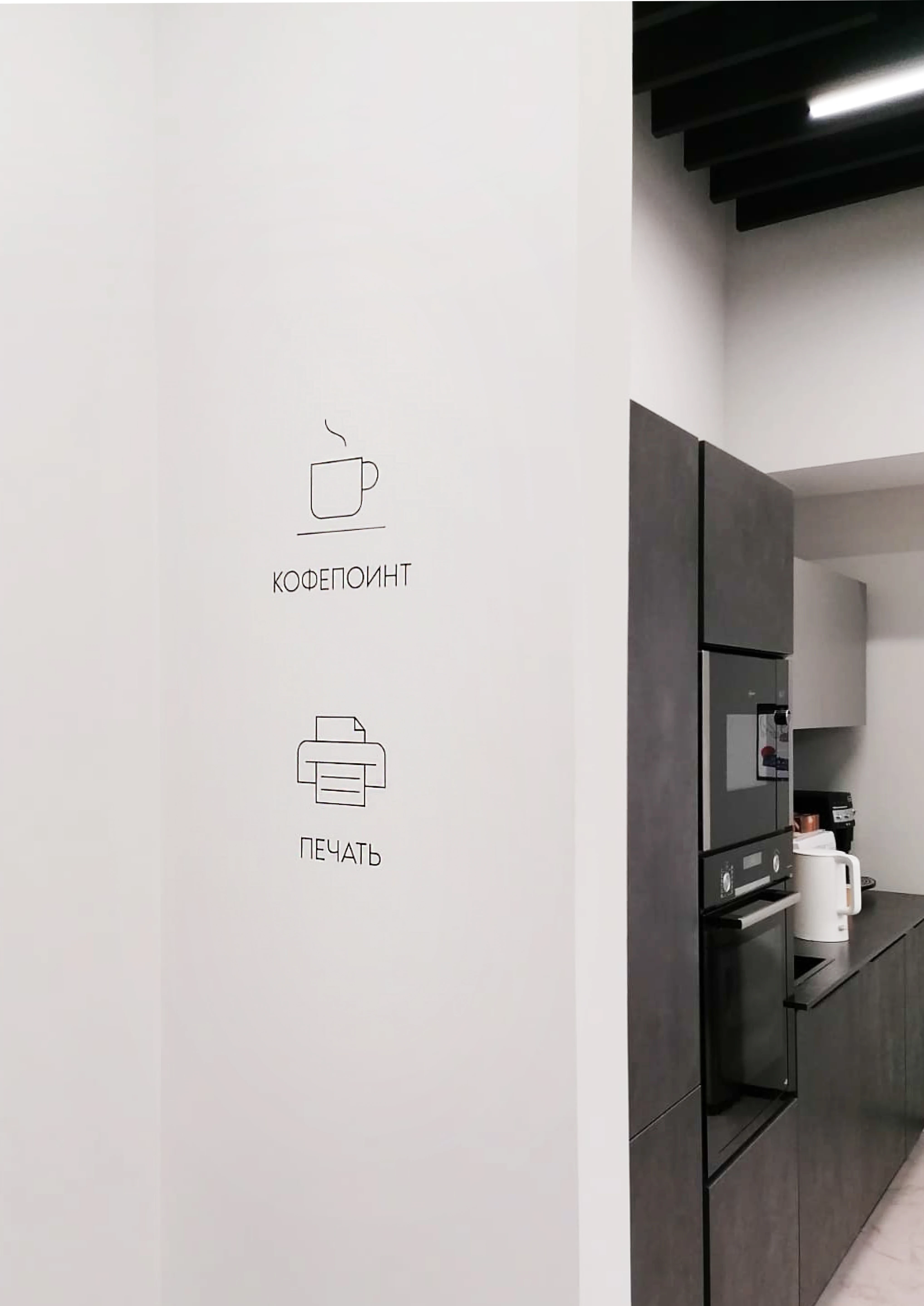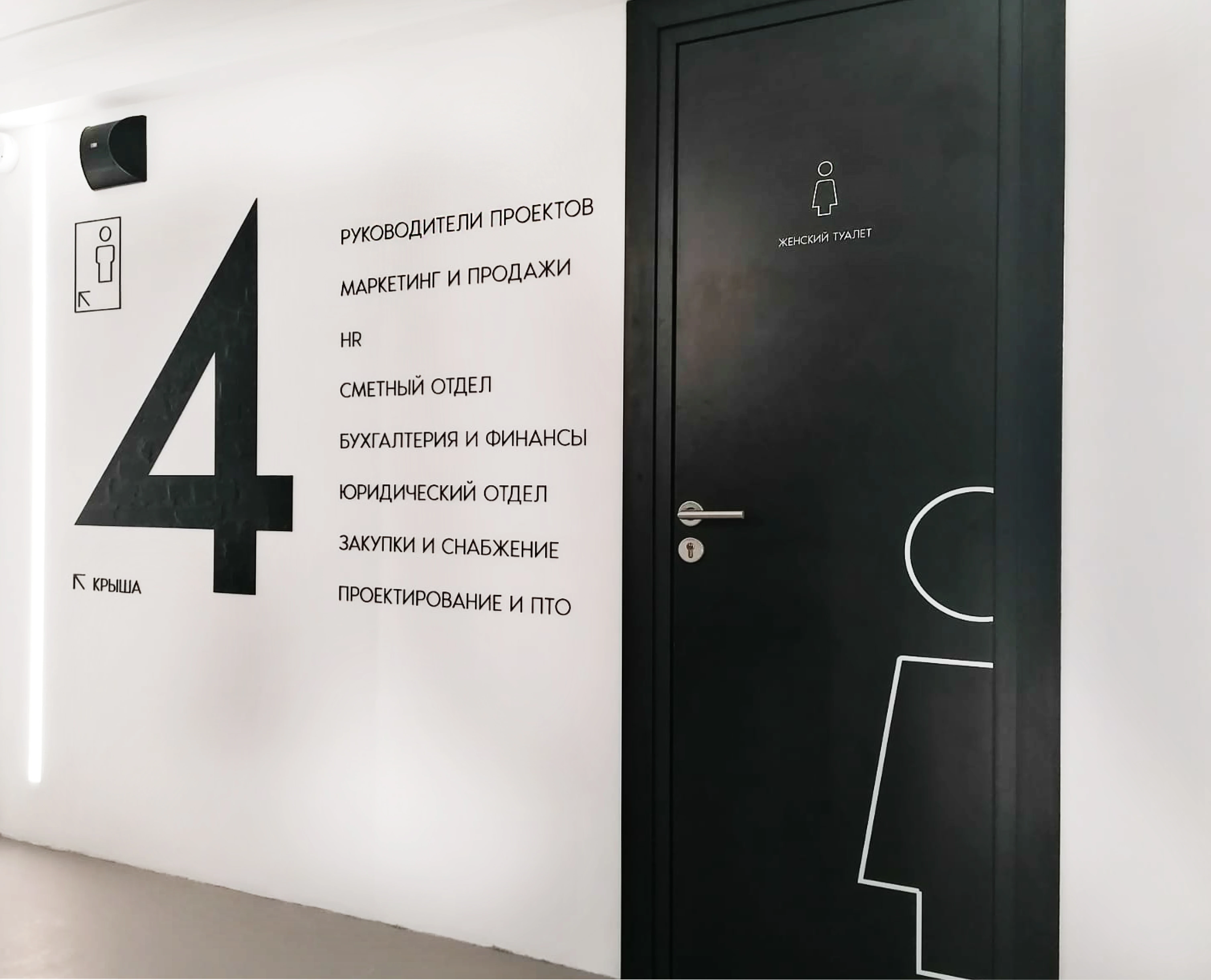 Интересный и сложный проект, который требовал большого внимания к деталям, ведь в нём не было цельных указателей или табличек. Каждый символ - отдельный элемент, вырезанный на лазере и смонтированный при помощи трафаретов. При выполнении работы было важно учесть особенности пространства, чтобы информация была размещена именно там, где её будет легко прочитать.