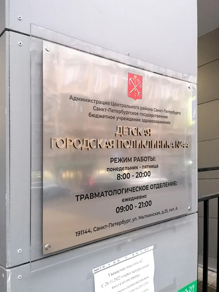Фасадные таблички размещают на улице у главного входа. Как правило, на них указывают полное название организации, юридический адрес и т. п. На табличках государственных учреждений часто можно увидеть герб города или района.