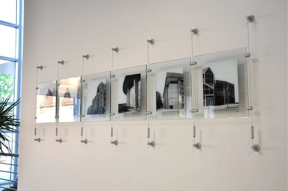 Галерейная система – сборная конструкция, которая состоит из однотипных секций и с панелями из оргстекла, закрепленных на тросах. Благодаря специальной фурнитуре, фотографии можно размещать в ряд, в шахматном порядке, "лесенкой" или просто ассиметрично, в зависимости от задачи.