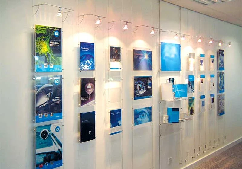 В галерейной системе прозрачное оргстекло используется как основа для размещения постера или рисунка. Это прозрачный материал, который крепится к тросам при помощи специальной фурнитуры - стальных или латунных держателей.